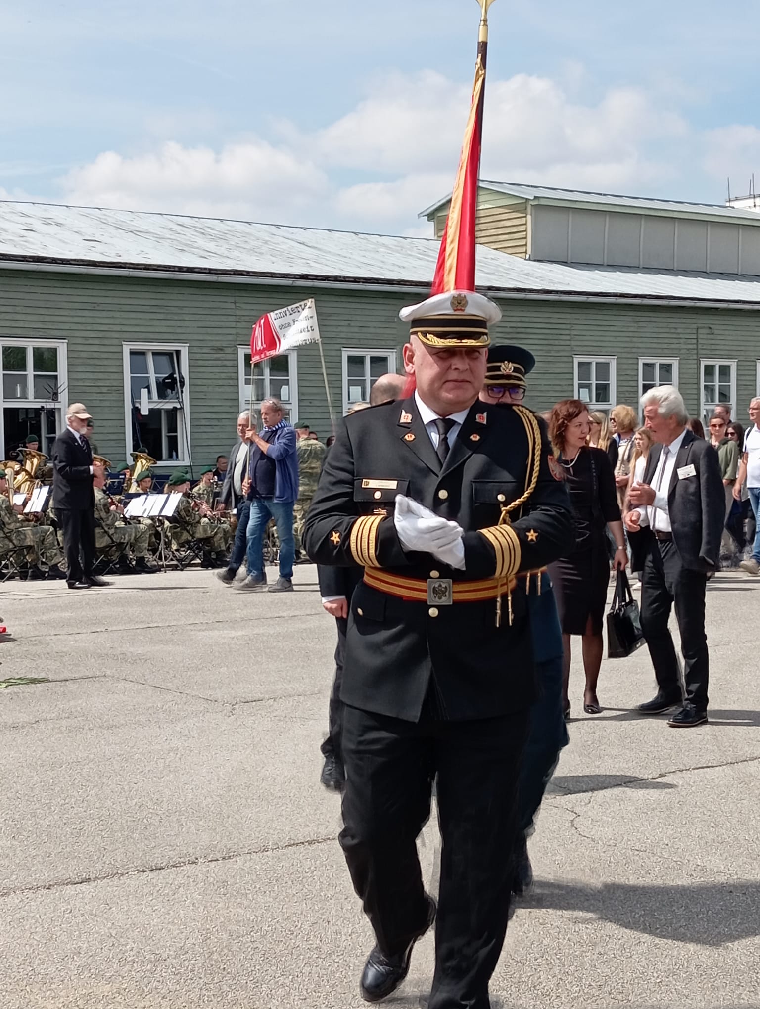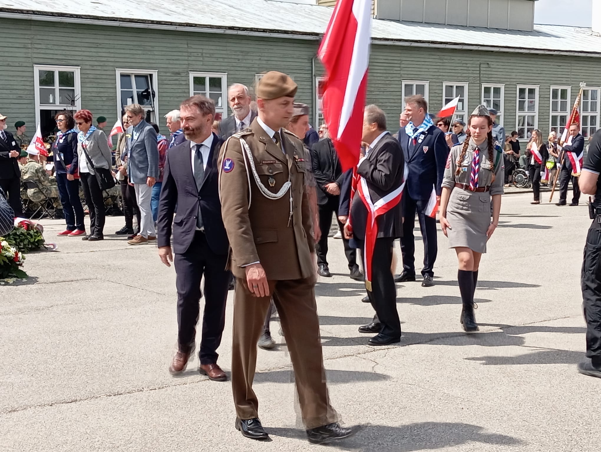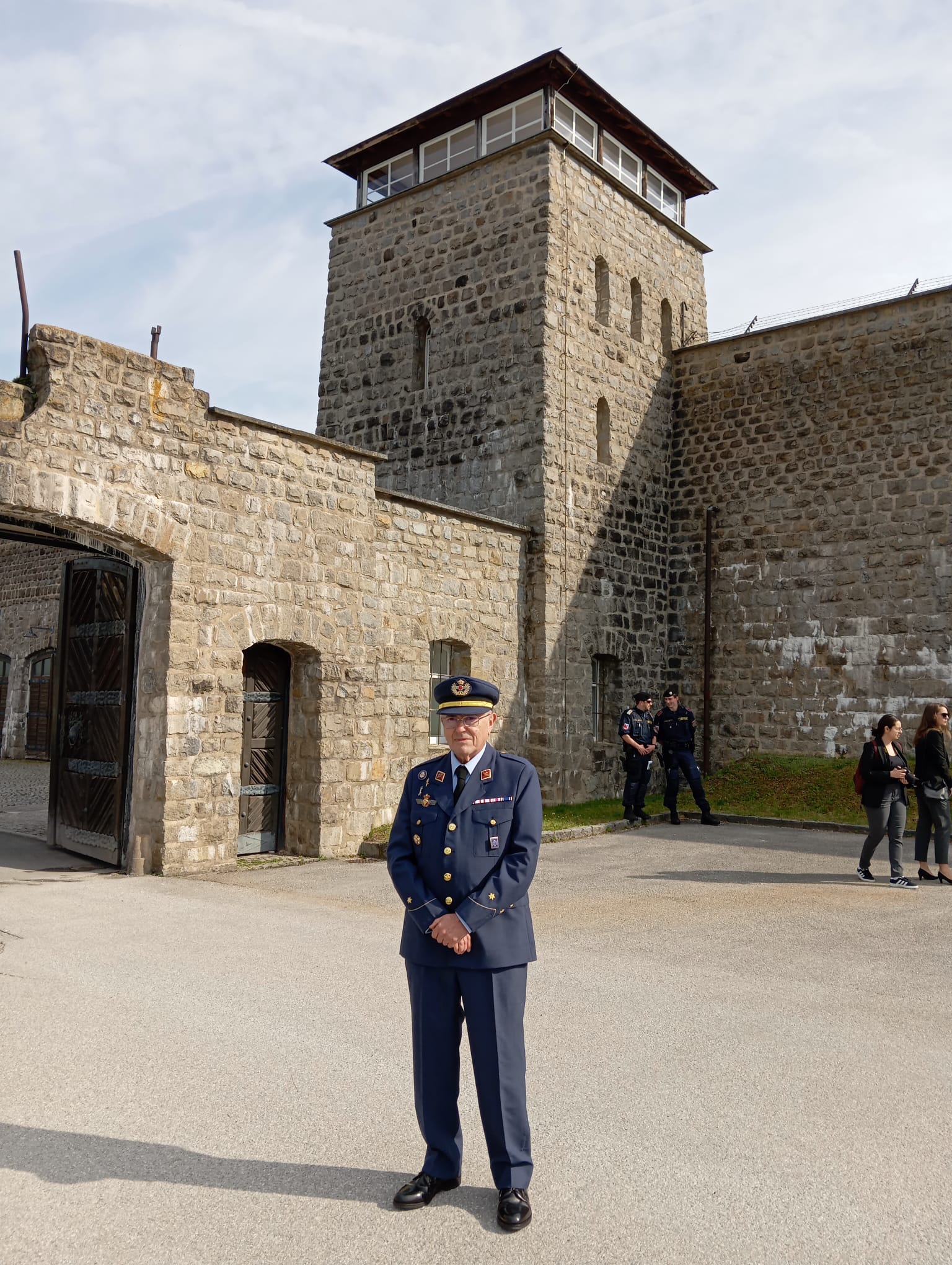 «Permítame señor Ministro que le felicite por su intervención. Como representante de la Asociación para la Memoria Militar Democrática española, integrada por militares en todas las situaciones administrativas, le felicito por su discurso, transmitiéndole nuestro saludo y pidiéndole traslade al gobierno nuestra petición para que en el 80º Aniversario de la liberación de este campo y ediciones posteriores, España esté aquí representada por una fuerza militar, coherente con las que vienen pasando por el memorial español para rendir homenaje a nuestro héroes.»