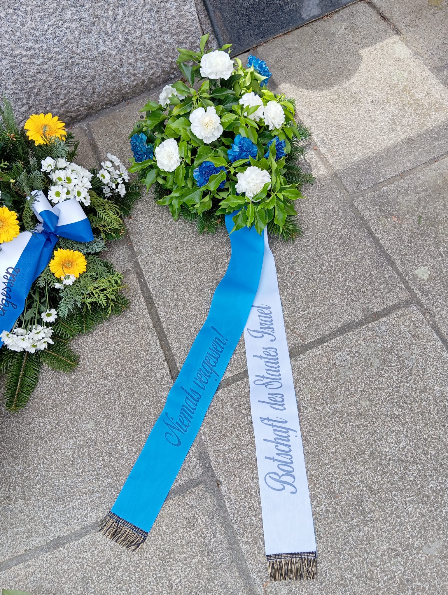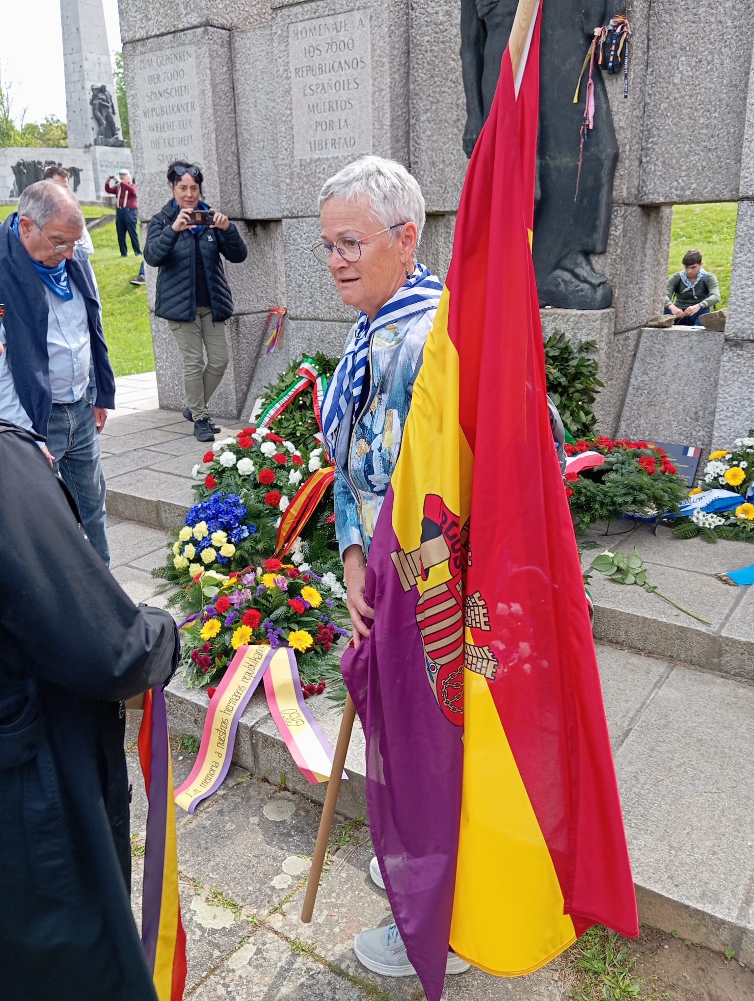 Como comprobamos que varias delegaciones militares comenzaban a desfilar ante el Memorial de los españoles, regresamos para presenciar los honores de los militares, portadores de ofrendas florales adornadas con los colores de sus respectivos países (un gesto que jamás ha sido correspondido por ninguna autoridad española).