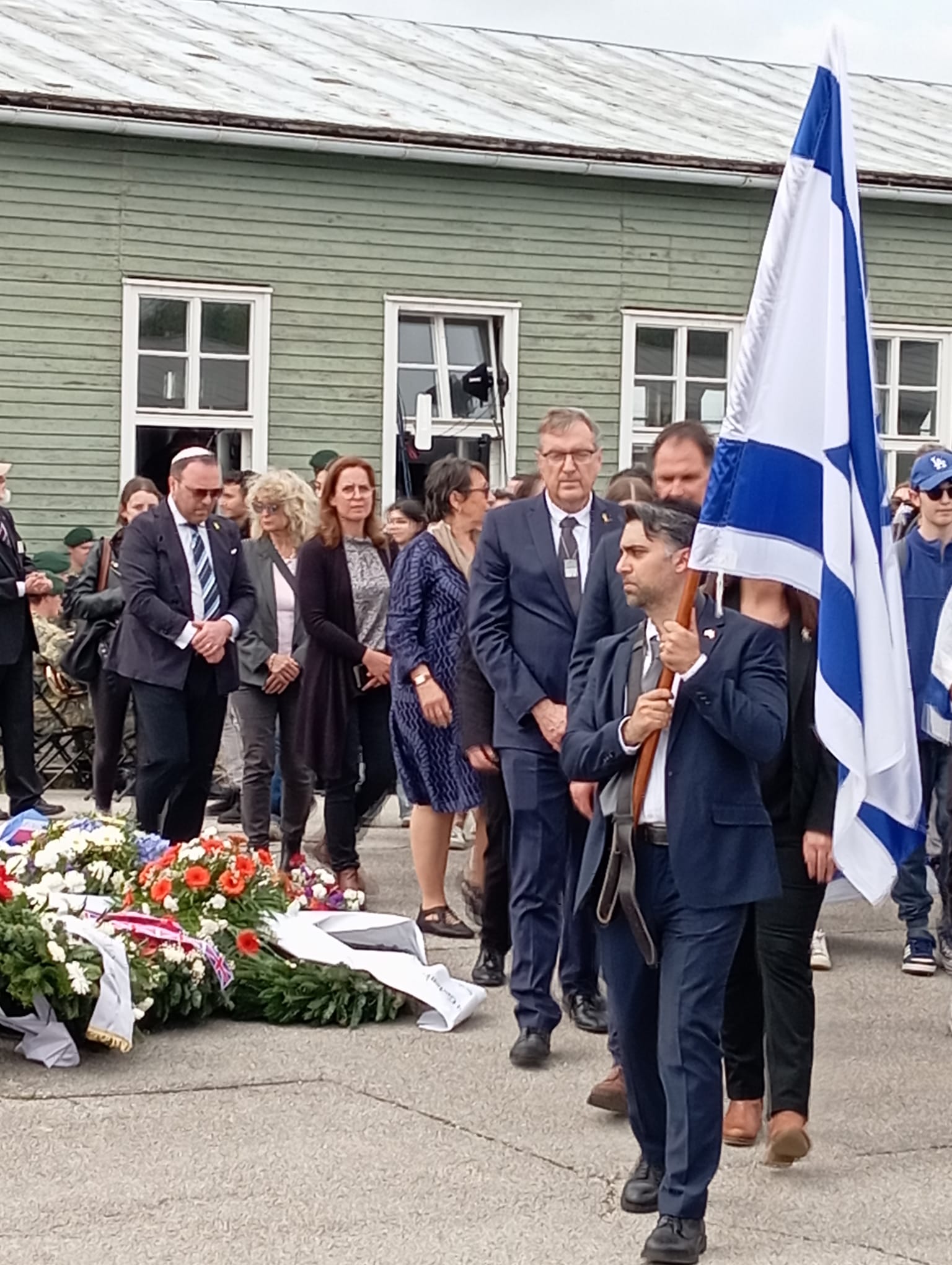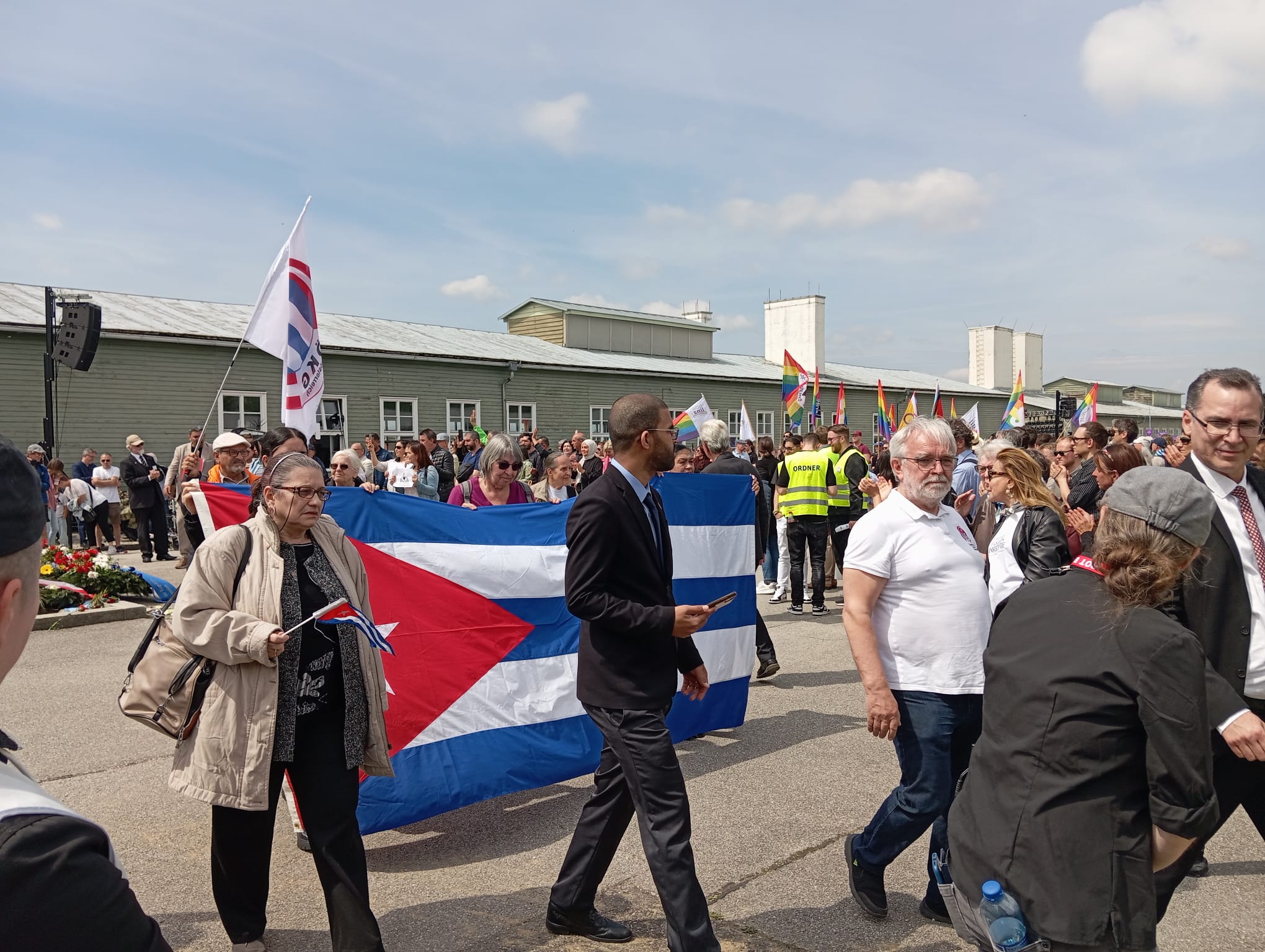 Sobre las 12h, comenzó el gran desfile de las delegaciones de más de treinta países y de numerosas asociaciones y organizaciones civiles predominantemente antifascistas y por la Paz, con sus banderas y coronas de flores que iban depositando en un inmenso círculo en el centro de la Apelplatz, mientras los militares que acompañaban a las autoridades y representantes civiles, rendían sus banderas y adoptaban el saludo militar (menos la representación española sin representación castrense), al tiempo que la televisión austriaca ofrecía en directo y a través de una enorme pantalla el desarrollo del acto.