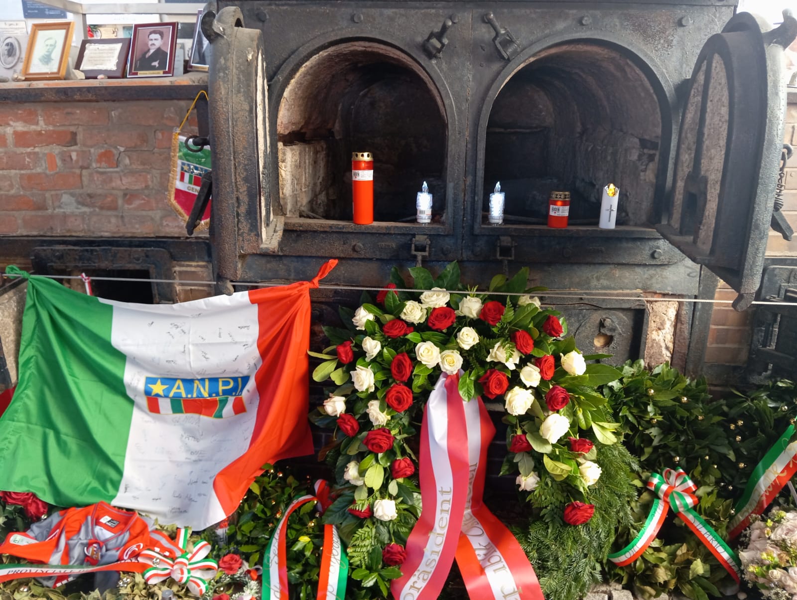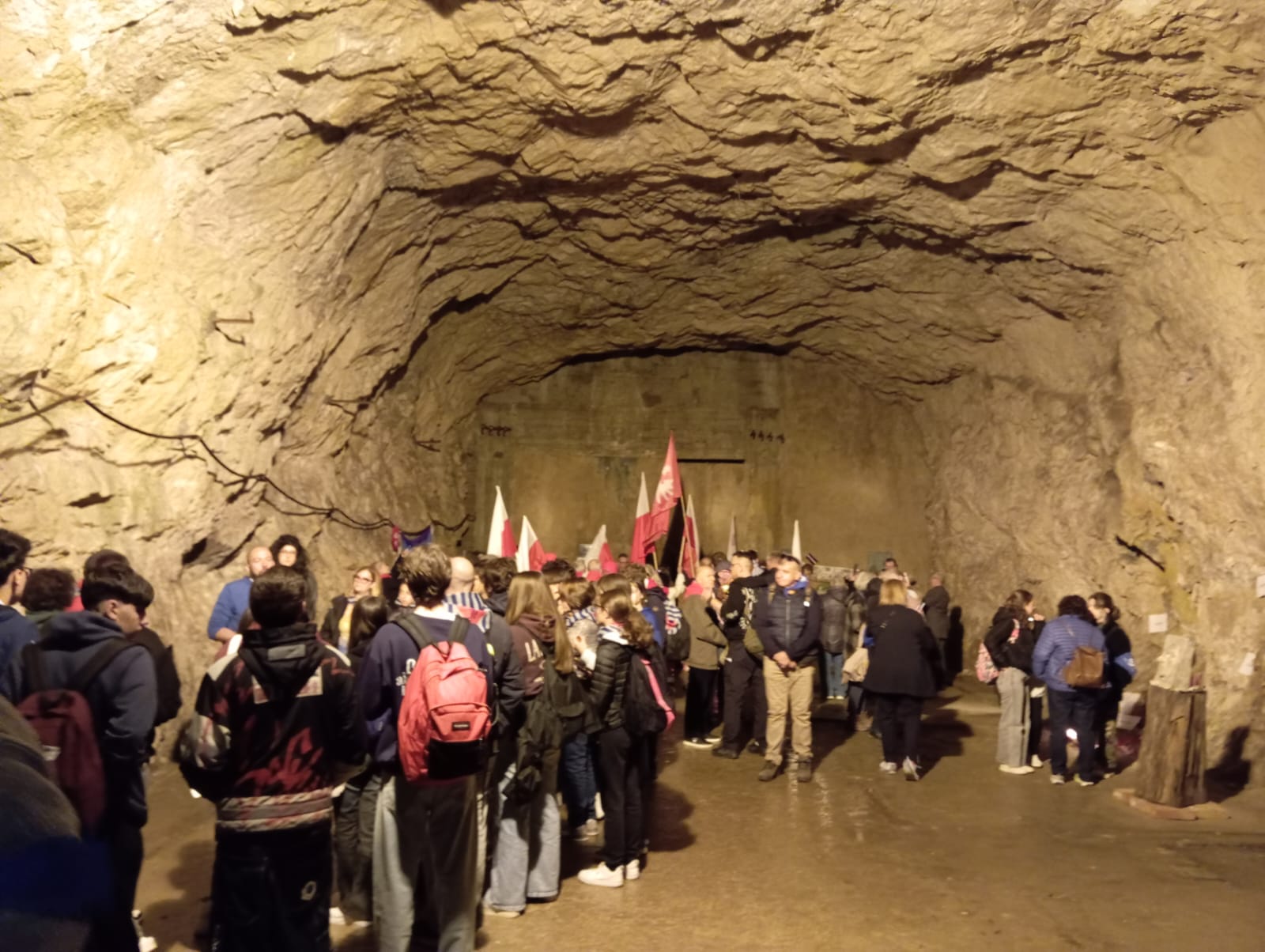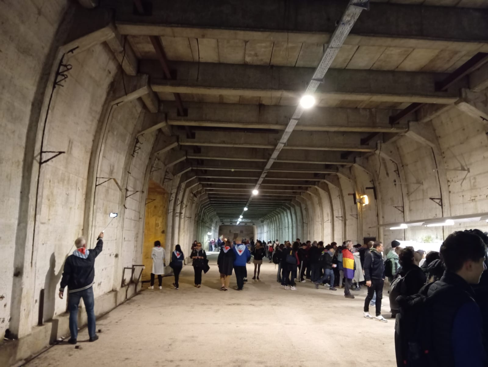 La primera parte de la jornada fue en los enormes túneles, a los que me referí en la crónica de ayer, en cuyo interior iban entrando y saliendo con sus banderas al frente, las diferentes delegaciones de países. En un túnel lateral iluminado con una extraña luz anaranjada, tuvo lugar el homenaje que tradicionalmente realizan conjuntamente las delegaciones españolas e italianas con el canto de O bella ciao y del Canto a la libertad de Labordeta, bajando posteriormente a la zona de fosas comunes, donde se reparten por una amplia superficie, diferente pequeños monumentos, recordando a las víctimas asesinadas, amparados por las banderas de los diferentes países, incluyendo la de Israel.
