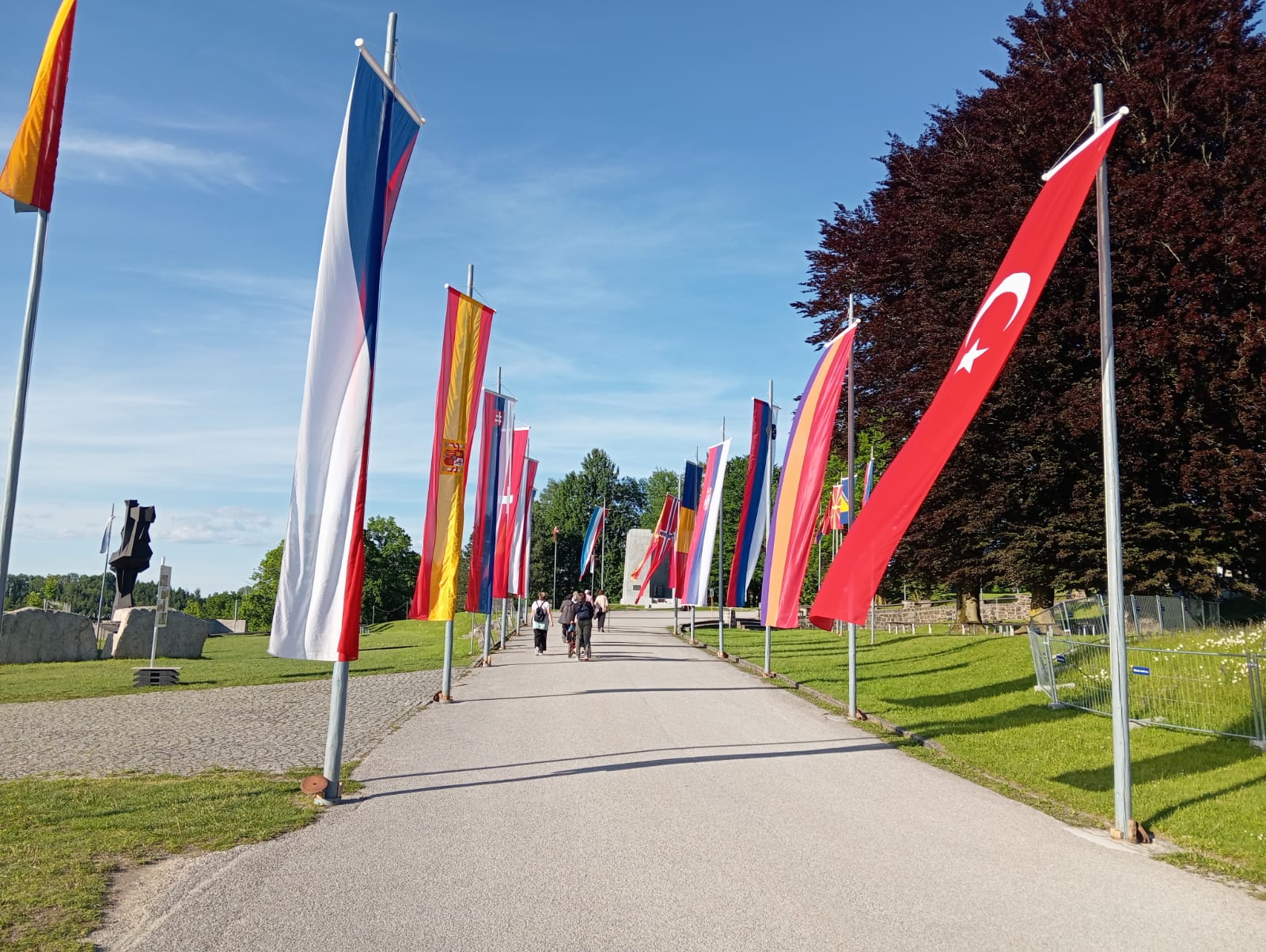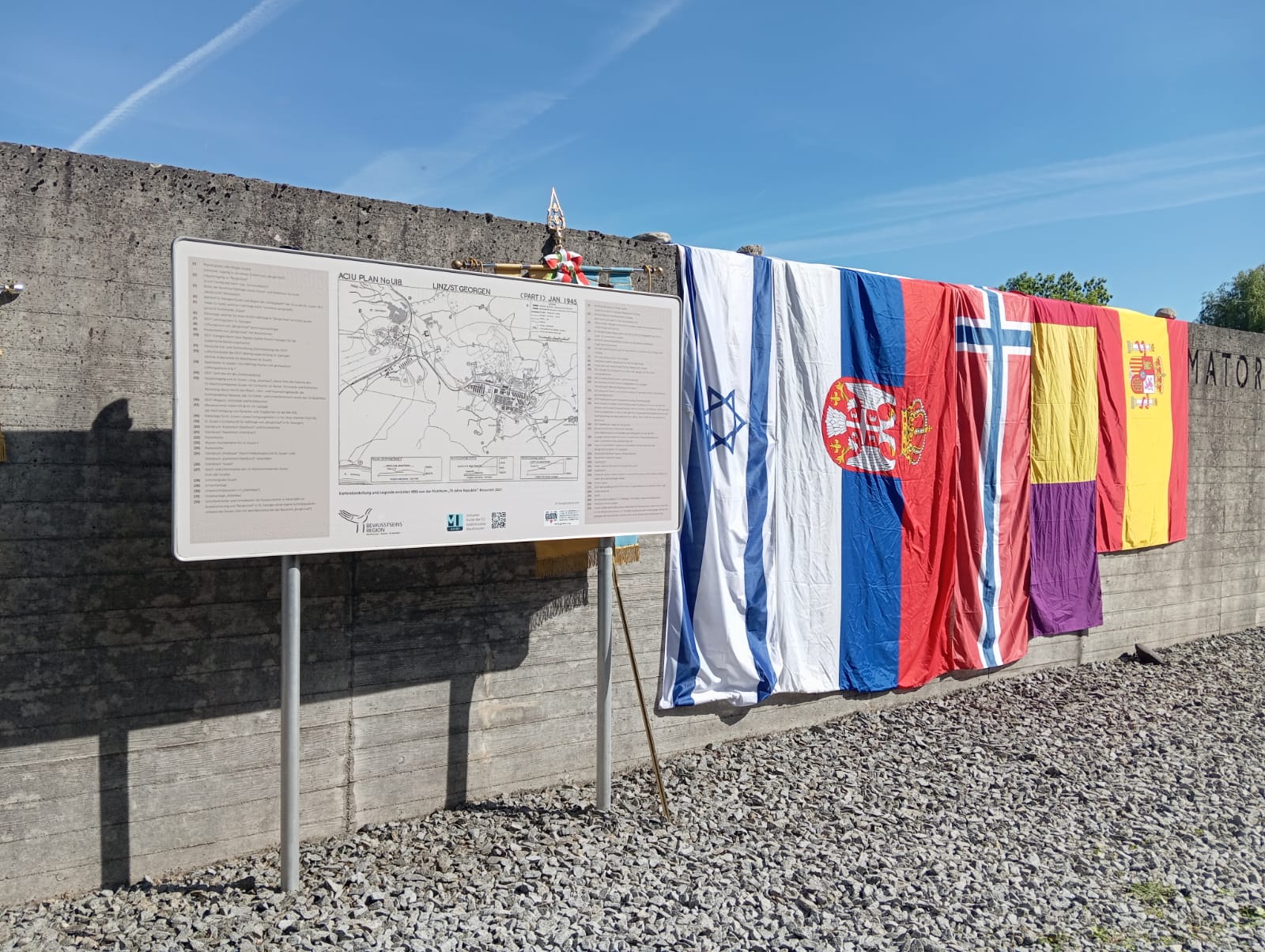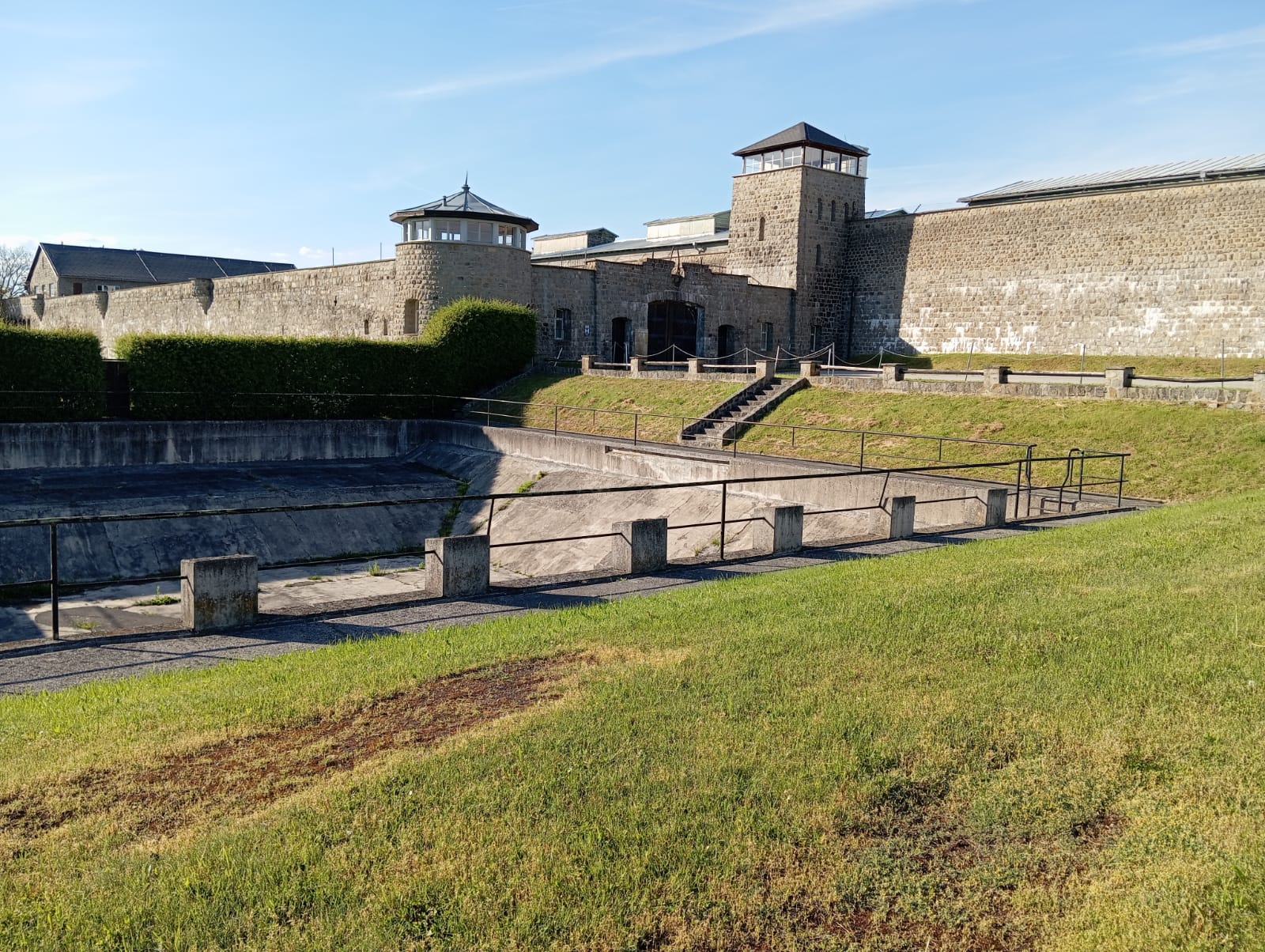 Por la tarde participamos en el campo de exterminio de Gusen en otro acto multinacional, aunque como llegamos tarde por los pelos, solo pudimos hacer el recorrido del Memorial, atestado de gente, para posteriormente descender por carretera hasta la zona de las canteras de granito, donde está la famosa «escalera de los españoles«, cuyo acceso por la parte superior e inferior estaba cerrada. Todo envuelto en un profundo silencio, que contrastaba con la belleza extraordinaria de aquel falso plácido entorno.
