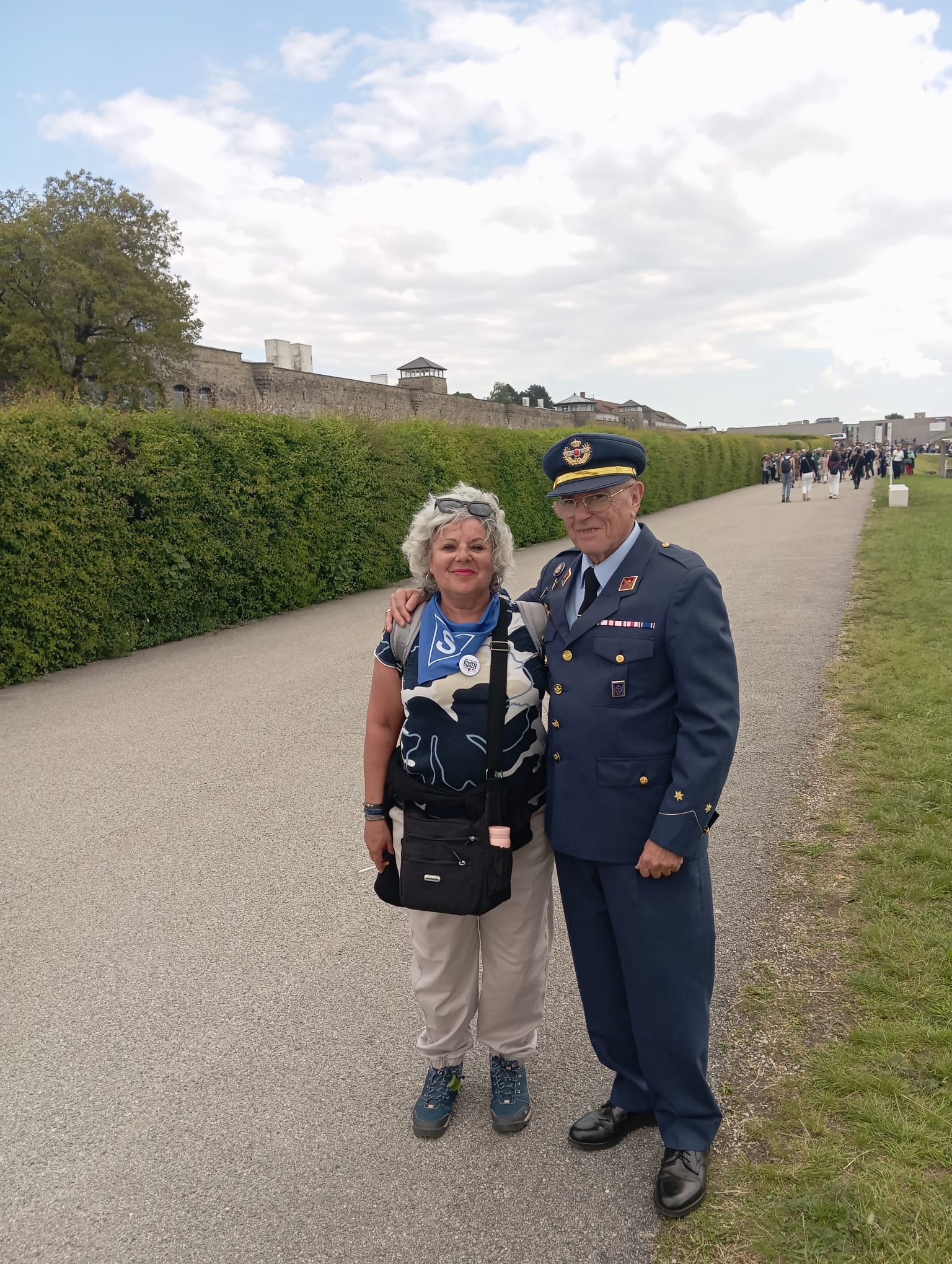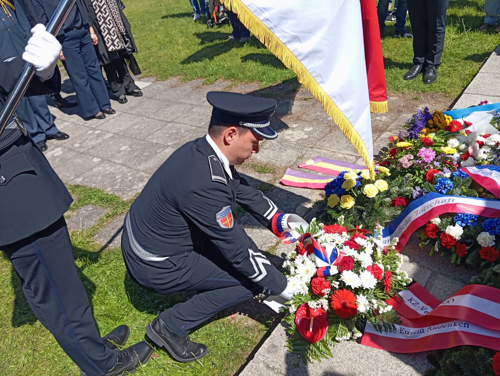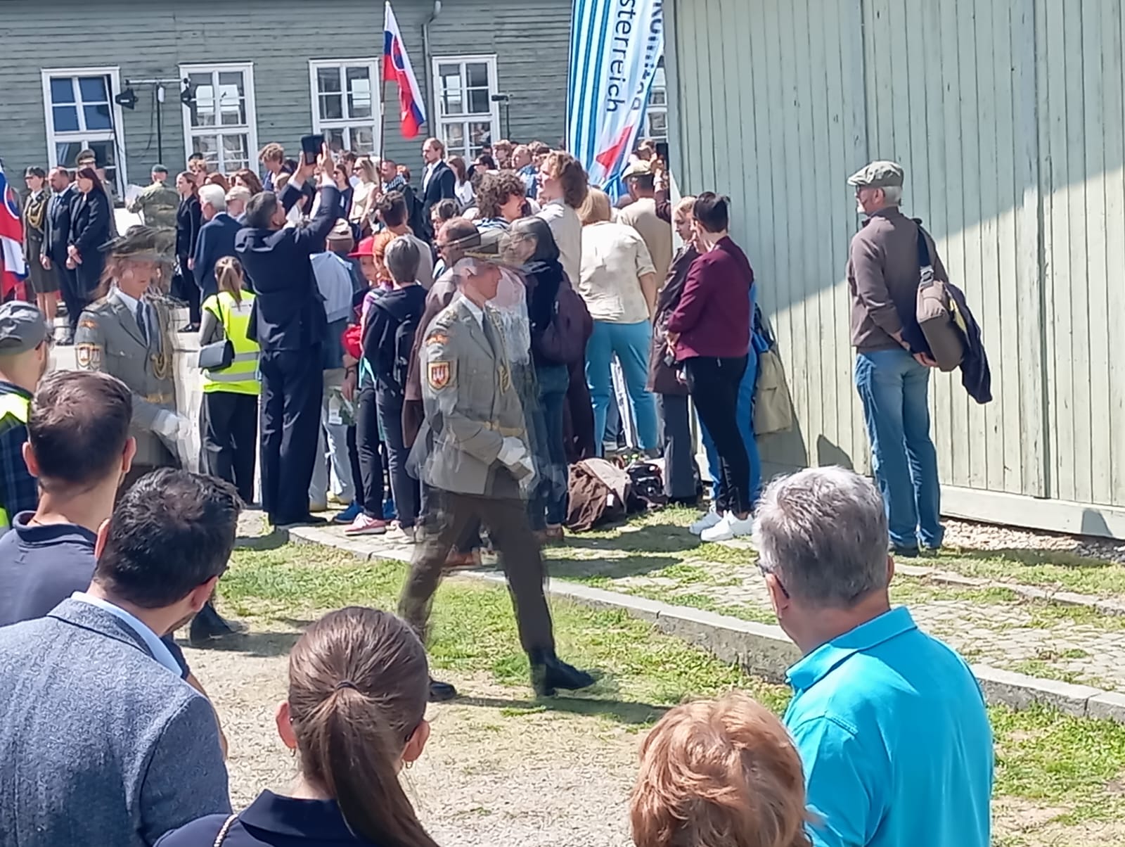 Vestido con el uniforme del Ejército del Aire, me encontraba detrás de la famosa pancarta, y antes de llegar a unos metros del lugar de las ofrendas, donde las autoridades, militares y demás comitiva se detienen y rinden sus banderas nacionales en honor a las víctimas, me adelanté situándome delante de la pancarta y encarándome frente a los dignatarios europeos y a las ofrendas allí depositadas, me cuadré saludando militarmente, inclinando la cabeza en homenaje a las víctimas del nazismo, siendo saludado a continuación por el maestro de ceremonias y situándome de nuevo detrás de la pancarta continuando nuestro camino.