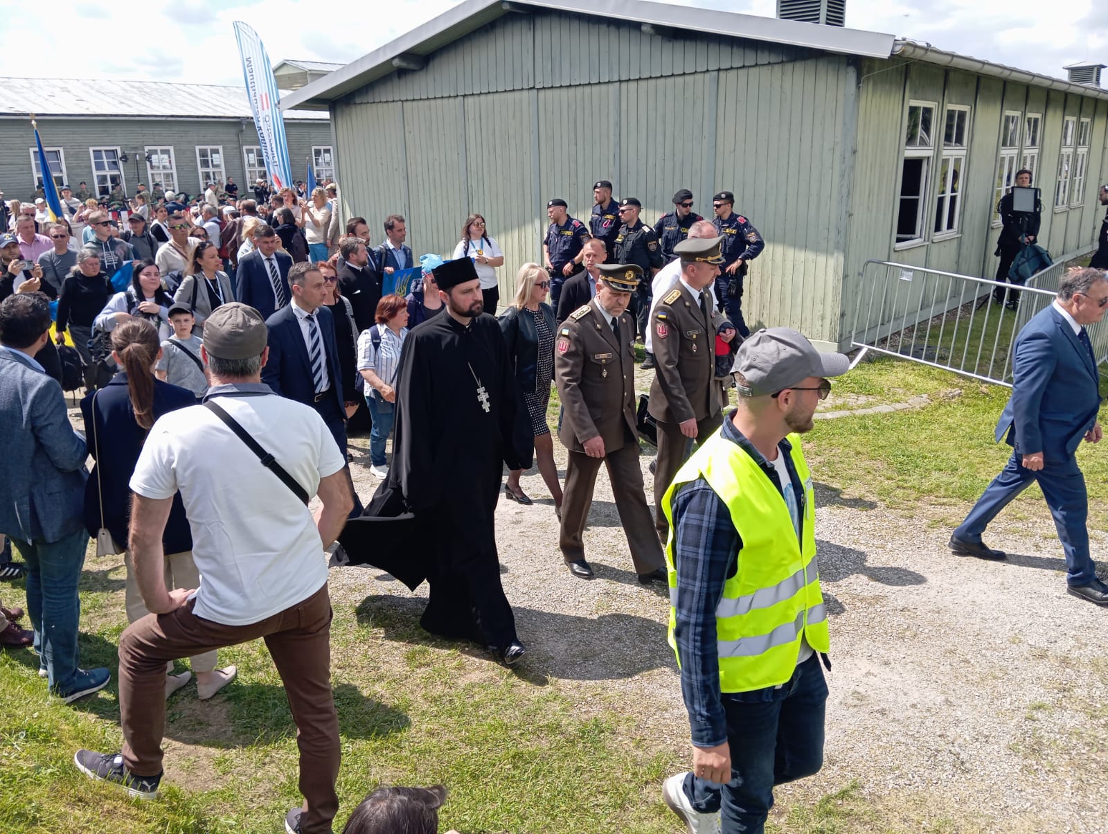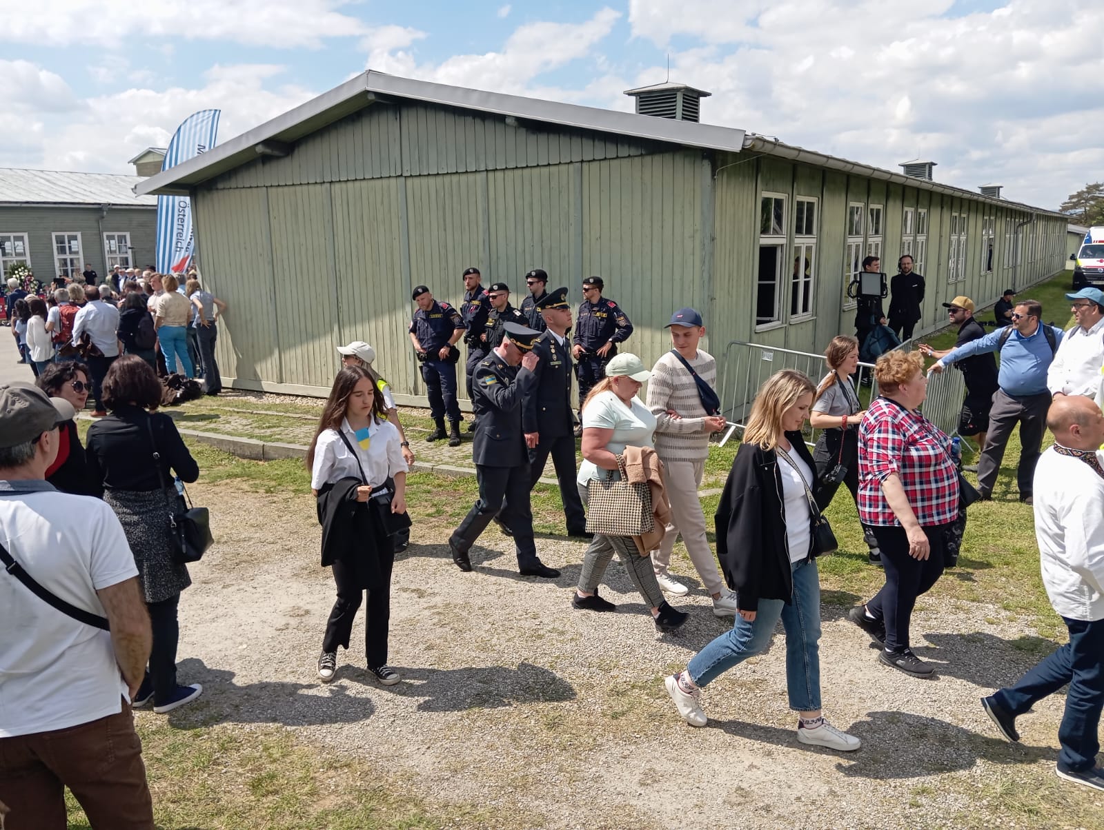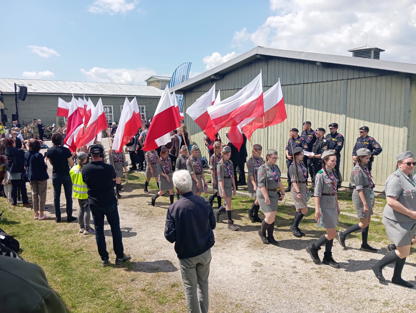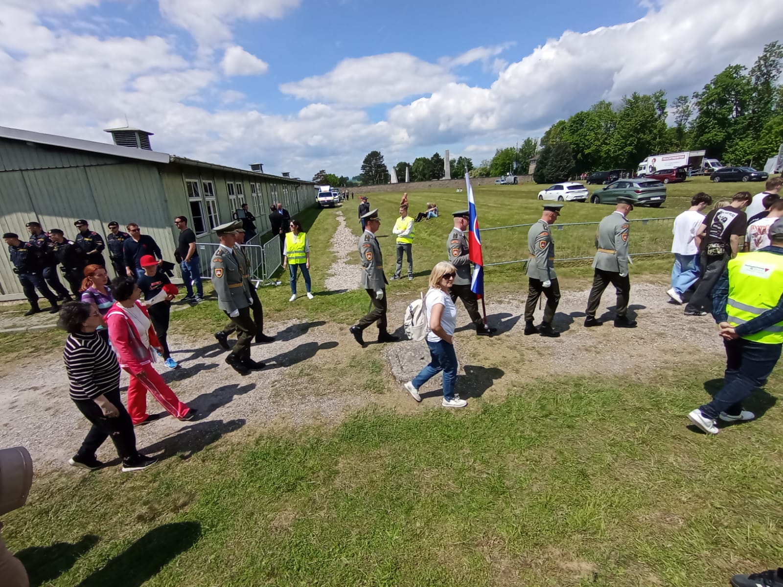 Vestido con el uniforme del Ejército del Aire, me encontraba detrás de la famosa pancarta, y antes de llegar a unos metros del lugar de las ofrendas, donde las autoridades, militares y demás comitiva se detienen y rinden sus banderas nacionales en honor a las víctimas, me adelanté situándome delante de la pancarta y encarándome frente a los dignatarios europeos y a las ofrendas allí depositadas, me cuadré saludando militarmente, inclinando la cabeza en homenaje a las víctimas del nazismo, siendo saludado a continuación por el maestro de ceremonias y situándome de nuevo detrás de la pancarta continuando nuestro camino.