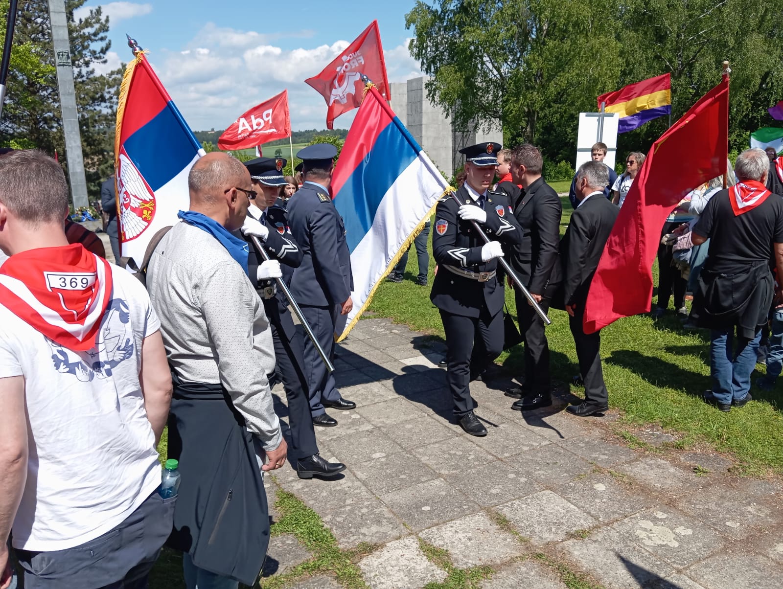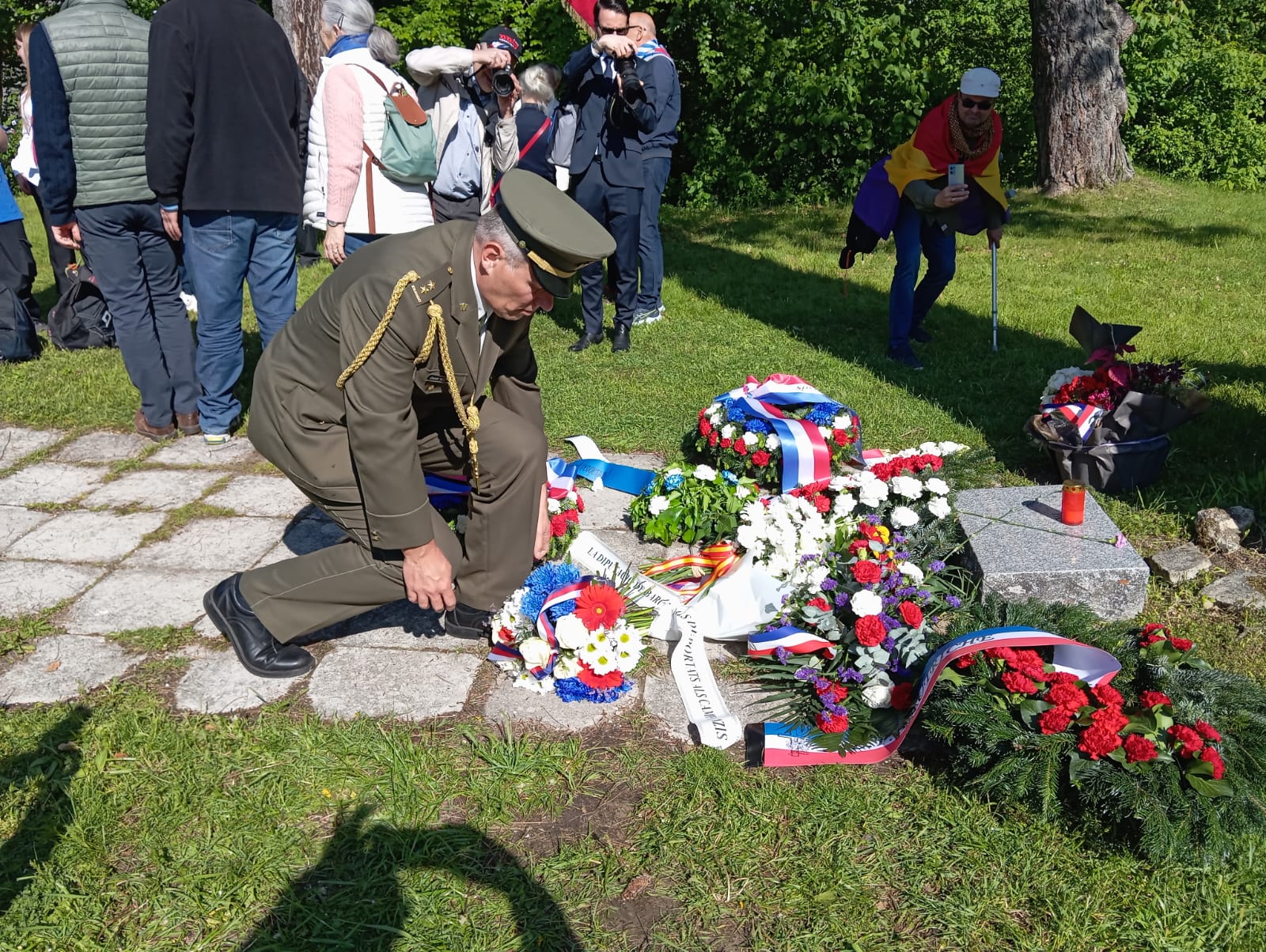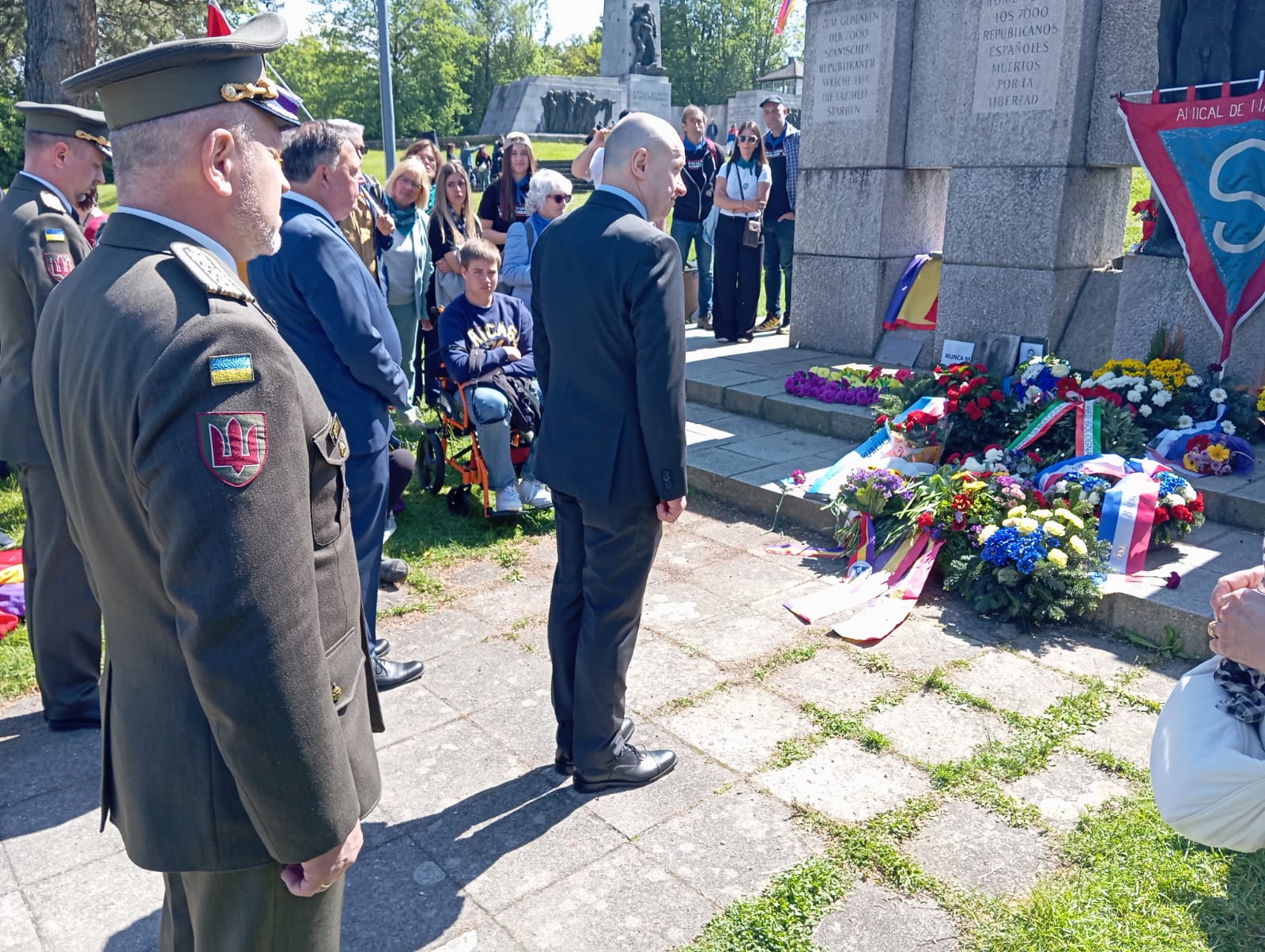 A lo largo de toda la mañana y mientras permanecíamos allí, fueron acudiendo, una tras otra, delegaciones de diferentes países con sus autoridades y fuerza militar al frente, para depositar ofrendas florales y rendir con sus banderas honores oficiales a las víctimas españolas. Un gesto que la representación oficial española, sobre la que ya hablaremos, se abstiene de corresponder.