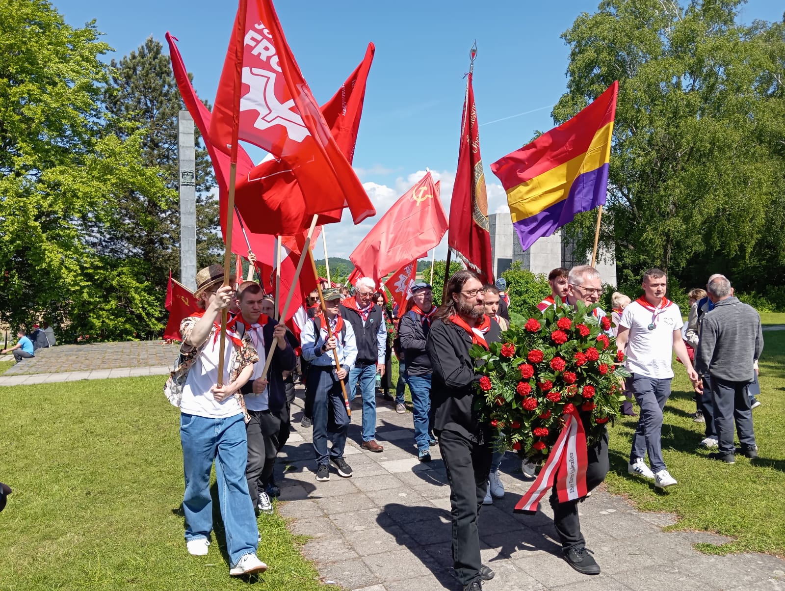Más tarde desfiló la escasa delegación oficial de la Embajada española en Austria con la bandera rojigualda y una corona de flores que fue depositada en honor de las víctimas. Seguidos unos metros más atrás por el nutrido grupo de la Amical española con numerosísimas banderas republicanas.
